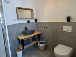Die Wohnung liegt im ersten Stock des neugebauten Hauses und ist über eine seitliche Steintreppe bequem zu erreichen.